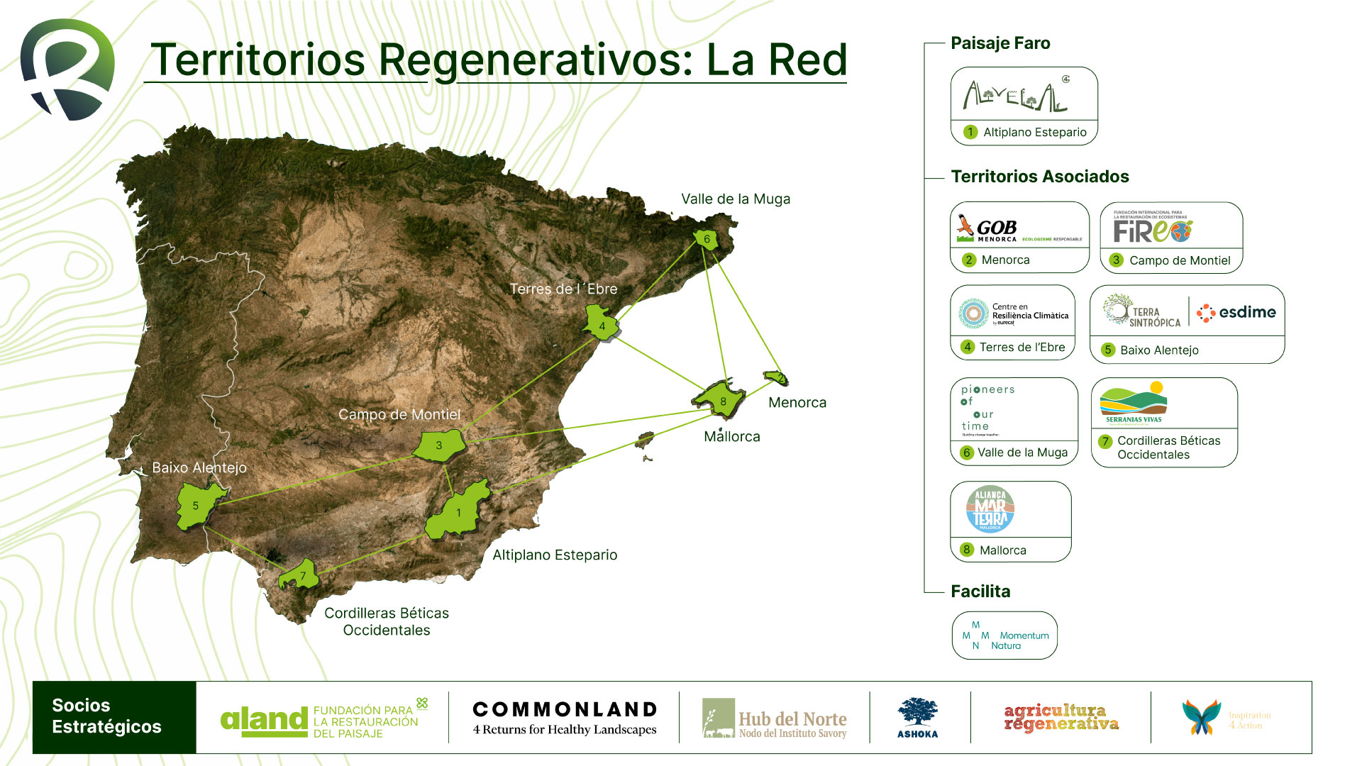 La Red de Territorios Regenerativos está formada por ocho organizaciones que operan en territorios de la península ibérica, en España y Portugal, junto con seis entidades aliadas estratégicas que aportan valor y colaboran en la regeneración de nuestros paisajes.
